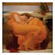 Flaming June by Frederic Leighton, oil on canvas 1895, est un tableau d'une figure féminine drapée au repos, reposant dans un intérieur élégant en marbre, la lumière naturelle du soleil couchant éclairant la scène dans une gamme de couleurs chaudes et brillantes comme l'or liquide. L'élégante figure classique et les contours lisses évoquent les nymphes et les figures drapées de la sculpture de la Grèce classique, tandis que l'inclusion du toxique plante Oleander ci-dessus rappelle romantique le lien entre le sommeil et la mort. Flaming June est la peinture la plus célèbre de l’artiste parmi beaucoup qui sont en train de regagner la reconnaissance après une longue période de négligence de l’art de l’époque victorienne.