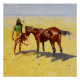 Frederic Remington était un peintre, illustrateur, sculpteur et écrivain américain connu pour son art représentant les cowboys, les soldats et les Amérindiens du Vieux-Ouest. Originaire de Canton, New York, Remington s'est inspiré de ces sujets dès son plus jeune âge. Il aimait l'idée de la frontière et voyageait à l'ouest de nombreuses fois. Il admirait beaucoup les cow-boys et soldats rugueux et héroïques qu'il y rencontra, écoutant leurs histoires et suivant leur vie dans ses visites de journaliste/illustrateur. Lors de ces voyages, Remington a pris un appareil photo et a fait ses propres photos, non pas comme de l'art, mais comme des notes. Il portait des carnets et esquissait tout, des horizons lointains aux détails des plis sur les bottes en cuir. Il travaille pour les grands magazines des années 1880 et 1890 et produit plus de 3 000 tableaux et dessins signés. La plupart d'entre eux étaient des illustrations, mais beaucoup ont été faites comme art alors qu'il se détournait du monde de l'édition et accompli un art magistral. Cette image est appelée "Chassé vers le bas" et représente un Indien courageux debout seul dans le désert avec son poney de baie à ses côtés. Il tient un tomahawk dans la main et semble se préparer à un combat désespéré.