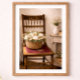 A soft French country still life featuring a vintage wooden chair with a woven basket of delicate blush and cream flowers. This peaceful cottage A charming French country still life featuring a vintage wooden chair and a woven basket filled with delicate cottage flowers. Soft botanicals and rustic textures create a peaceful countryside scene inspired by French cottage interiors. Perfect wall art for kitchens, breakfast nooks, coffee bars, and cozy cottage homes. This botanical still life poster brings timeless French country charm and gentle floral beauty to your space.