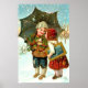 Boy, fille et parapluie vintage de Noël scène de neige.