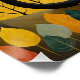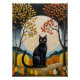 Cette oeuvre d'art fantaisiste et sereine présente un chat noir frappant comme figure centrale, assis au sommet et majestueux dans un paysage automnal stylisé. Derrière le chat, une immense et lumineuse pleine lune domine la scène, projetant une douce lueur sur des collines et un ciel sombre et étoilé. Les arbres environnants sont ornés de feuilles dynamiques et stylisés dans une palette chaleureuse de jaune, d'or et d'orange brûlé, qui contraste magnifiquement avec les tons cool de l'arrière - plan. L'oeuvre mêle un sens du réalisme magique à une esthétique d'art populaire, créant une scène captivante et tranquille remplie de charme mystique.