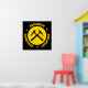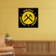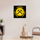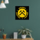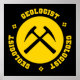 Poster noir et jaune avec emblème de marteaux de roche croisés entouré par "GEOLOGIST" en lettres collégiales répétées.
