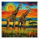 A.I. l'interprétation créée de deux girafes aux couleurs vibrantes se tiennent en tête sur un fond de savane africaine stylisée sous un ciel tourbillonnant avec de multiples orbes solaires. La scène est peinte dans un style fantaisiste et surréaliste, avec des traits exagérés et des couleurs audacieuses et contrastées.