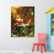 A charming vintage Christmas poster featuring Santa Claus reading lists of wishes surrounded by his diligent elves.