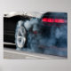 Voiture noire en train d'effectuer un brûlage, roues tournantes causant la fumée des pneus. Photographie.