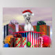 Partagez une Surprise de vacances avec cette Merle Great Dane recadrée portant un casquette du Père Noël sortant d'une énorme boîte cadeau. OEuvre de Noël des Danois-R-Us.