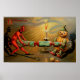 Un beau poster vintage avec un diable et un personnage citrouille essayant d'ouvrir un pétard.