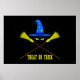 Dessin du casquette d'un sorcier bleu, décoré d'étoiles jaunes et de deux balais de sorcières croisées sous le casquette. Les yeux jaunes démoniaques entre le casquette et les balais et un texte Traitez ou un tour. Drôle thème Halloween. Mange, bois et fais peur. Wallart, imprimé, poster, toile pour décorer votre chambre ou votre bureau