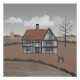 Colourful artwork of an old medieval house in the English countryside, with an old church in the background, and a couple of hares boxing in the foreground. Perfect for anyone who loves folk art.