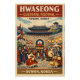 Travel poster featuring the Hwaseong Cultural Festival in Suwon, South Korea, illustrated in a refined retro vintage style. Majestic Hwaseong Fortress walls and gates as the central focus, with traditional Joseon-era performers in hanbok, royal procession, flags, drums, and lanterns creating a festive atmosphere. Warm yet elegant color palette: stone gray, deep red, indigo blue, cream, muted gold. Clean graphic shapes, subtle grain texture, classic poster composition. Add bold vintage typography: “HWASEONG CULTURAL FESTIVAL – SUWON, KOREA”. Vertical 2:3 layout, high-resolution, suitable for print.