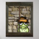 Petit monstre vert mignon avec des crocs regardant par la fenêtre de son château. Dessin dessiné numérique original par Taylor Addams.