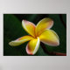 Une photographie à visée douce d'une belle fleur de plumeria jaune odorante, dressée contre un arrière - plan vert foncé.