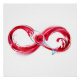 Infinity symbole of continuous stream of red pouring into glass glass glass on white background.