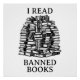 Illustration numérique en noir et blanc d'une pile de livres avec la légende "I Read Banned Books".
