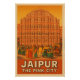 Affiche de voyage rétro de Jaipur, Inde, avec l'emblématique Hawa Mahal (Palais des Vents) avec sa façade en grès rose brillant par une lumière chaude au coucher du soleil.
