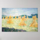 Les Jeunes Dames de Giverny, Effet Soleil de Claude Monet, huile sur toile 1894, est un tableau paysager d'un champ de balles de foin verticales chatoyant dans les couleurs chaudes jaune et or sous un ciel bleu vif et nuageux. Les chemises ressemblent à des femmes en jupe longue comme si elles dansaient en ligne, d'où le titre de l'image. Monet peint la scène en bref, brushstrokes rapides de tons chauds jaunes et profonds, bleu cool, en utilisant les schémas de couleurs complémentaires qui caractérisent tant d'art impressionniste.