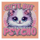 Un chaton moelleux aux yeux brillants est orné de fleurs roses, entouré de l'expression "mignon mais psycho" en lettres roses audacieuses. Les coeurs et les étoiles accentuent le design ludique mais pointu.