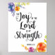 Design de typographie calligraphique moderne avec des mots noirs, "La Joie du Seigneur est ma Force." Le design est coloré aquarelle bordé de fleurs peintes à la main dans les coins supérieur gauche et inférieur droit.