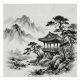 Rendered in a traditional sumi-e style, this artwork features a serene pavilion set within a natural landscape of pine trees and distant mountains. Soft brush strokes and layered ink washes create depth and atmosphere, while the minimalist composition and negative space evoke calm and balance.
