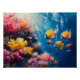 Une scène sous-marine fascinante avec un récif corallien plein de vie. Des poissons tropicaux colorés nagent gracieusement parmi les coraux jaune, rose et rouge vif, tandis que la lumière du soleil filtre à travers l'eau bleue cristalline, créant un spectacle éblouissant de lumière et de mouvement.