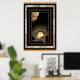 graphisme art déco encadré de tuiles avec orbe brillante, femelle inclinée en tissu tourbé regardé par le grand visage au-dessus fixé dans un ciel étoilé.
