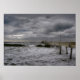 Une vague commence à se briser à la jetée Pacifica en béton taché de rouille. Au premier plan, les restes mousseux d'une vague précédente se détachent. Le ciel hivernal dramatique semble prêt à éclater de pluie.
