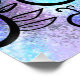 Un petit oiseau drôle dans le coin supérieur gauche et des éléments floraux sur un arrière - plan rose, violet et turquoise.