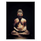 L'image présente une statue en bronze de Bouddha, assise dans une pose méditative, les mains reposant sur les genoux. La statue est sculptée avec des détails complexes, y compris une expression sereine sur le visage et des robes coulantes. Le Bouddha est représenté dans un arrière - plan sombre, presque noir, qui met en valeur la couleur dorée de la statue