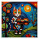A.I. a créé l'impression d'un chat musicien debout en vêtements vibrants jouant du violon au milieu d'un paysage surréaliste avec des arbres tourbillonnants et un soleil radieux.