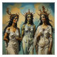 A.I. a créé une impression surréaliste de Trois Déesses Grecques antiques connues sous le nom de Moirai ou les 3 Soeurs du Sort. Ils étaient la personnification du destin - : Clotho (le spinner), Lachesis (le allotter), et Atropos (l'inévitable, métaphore de la mort), habillés de robes fluides et de couronnes ornées.