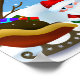 Père Noël avec son traîneau plein de cadeaux et un bonhomme de neige heureux. La scène est un jour d'hiver avec des flocons de neige tomber et la neige s'élève sur les branches de deux arbres. Au premier plan se dresse Père Noël avec son costume rouge vif et son casquette rouge vif, tous deux avec une garniture blanche moelleuse. Ceinture noire, mitaines vertes et bottes brillantes noires. Ses joues roses et ses grands yeux bleus s'élèvent derrière sa barbe blanche et moelleuse. A côté de Père Noël se trouve son traîneau avec un sac brun débordant de cadeaux. De l'autre côté de lui se trouve un bonhomme de neige enthousiaste qui attend de voir ce que Père Noël lui a apporté. Dans un chapeau noir et une écharpe rouge et verte chaude, le bonhomme de neige a un gros grain de charbon qui correspond à ses yeux de charbon, et une carotte pour un nez. Avec trois boutons noirs sur son front rond de boule de neige.
