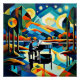 A.I.a créé une scène vibrante avec une personne jouant du piano contre un ciel étoilé fascinant au-dessus d'un cubiste coloré, paysage surréaliste comprend des collines roulantes, des arbres et un lac reflétant les corps célestes lumineux du ciel