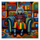 A.I.a créé l'impression d'un enfant avec une expression solennelle et les yeux tristes assis sur un fauteuil rayé, portant une tenue multicolore vibrante qui correspond aux motifs géométriques de l'arrière - plan.