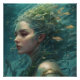 Une scène aquatique sereine présente une femme entourée d'eau tourbillonnante et de poissons, ses cheveux qui se déverse gracieusement autour d'elle. La lumière filtre à travers l'eau, soulignant sa présence éthérée et mystique.