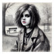 Une jeune fille au regard intense et mélancolique, vêtue d'un blouson en cuir et d'un t-shirt de Nirvana, est assise dans un parc désert. Son maquillage sombre et ses cheveux ébouriffés accentuent son allure rebelle et solitaire. L'ensemble est dessiné dans un style vintage.