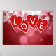 Illustration romantique montrant des coeurs rouges suspendus avec des lettres "LOVE" sur un arrière - plan de livre.