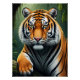 A striking tiger gazes forward with intense amber eyes, resting a paw on a log. Lush green foliage surrounds the scene, creating a vibrant jungle setting.