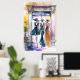 Affiche de trois figures féminines élégamment habillées portant des robes à la mode et des casquettes aux larges bords. Le cadre semble être un endroit chic, avec des éléments architecturaux et des couleurs arrière - plans douces et vives.