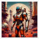 Un astronaute solitaire se dresse sur un paysage alien rocheux, contemplant une énorme structure robotique avec un dôme clair et des jambes mécaniques. De multiples planètes sont visibles dans le ciel, créant une scène frappante d'exploration spatiale.