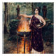 The scene unfolds in a mysterious woodland ritual setting. Medea stands poised beside a smoking cauldron, sprinkling enchanted ingredients into the glowing brew. Behind her rise solemn statues and a shadowed forest altar, heightening the atmosphere of ancient magic and myth. At her feet lie ritual objects and remnants of sacrifice, emphasizing the darker power associated with Medea’s legendary spells.