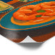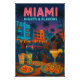 Affiche de voyage rétro de Miami, Floride, États-Unis, célébrant la vie nocturne et la culture alimentaire. Ocean Drive à la lumière du jour avec des bâtiments Art déco lumineux, des palmiers se balancent sous un ciel bleu violet