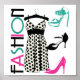 Design mignon avec une robe pointillée noire et blanche au centre, talons hauts en turquoise, rose chaud et noir à droite et le mot "mode" dans les mêmes couleurs à gauche