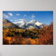 Une photo de paysage époustouflante de l'Utah du Mont Timpanogos à l'automne. Une belle montagne enneigée entourée d'arbres d'automne avec des feuilles dans des jaunes et des dorures chauds et un ciel bleu vif avec des éclats de nuages bouffants.