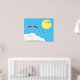 Trois mouettes volent dans un ciel bleu vif. Le coin inférieur gauche est composé de nuages blancs et moelleux avec des ombres grises. La mouette plus petite ou plus éloignée vole devant l'orbe jaune du soleil.