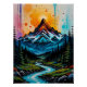 Discover the raw beauty and energy of nature with this graffiti-inspired scene. A towering mountain peak is rendered with bold black outlines and vibrant neon fills in shades of fiery orange, deep turquoise, and lush green. Integrated into an abstract background of splashes, drips, and dots, the design is further enriched by surrounding elements like a winding river and scattered trees. Printed on premium poster paper, this piece celebrates the majesty of the natural world through the lens of street art.