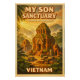 Travel poster featuring My Son Sanctuary, Vietnam, in a classic retro travel-poster style. Central focus on the ancient red-brick Cham temple towers rising from lush green jungle, partially covered in moss and surrounded by misty hills in the background. Soft golden sunrise light filters through tropical foliage, creating a mystical and sacred atmosphere. Delicate carvings and historic ruins evoke the rich cultural heritage of the Champa civilization. Warm, earthy color palette of brick red, jungle green, soft mist gray, and golden sunlight. Clean graphic illustration with subtle vintage grain texture. Bold vintage typography headline: “MY SON SANCTUARY – ECHOES OF CHAMPA”. Vertical 2:3 layout, high-resolution, print-ready.