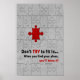 "N’essayez pas de vous intégrer ... quand vous trouverez votre place, vous le saurez!" — pièce de puzzle rouge audacieuse qui s’intègre parfaitement dans un puzzle gris. Texte : lettres en gras rouge et noir.