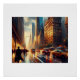 De grands bâtiments baignent dans une lumière dorée et chaude tandis que des véhicules et des piétons occupent une rue animée de la ville. Les réflexions dansent le long du trottoir humide, créant une atmosphère dynamique et dynamique.
