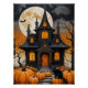 Une silhouette éffrayante d'une maison hantée se dresse contre une pleine lune vibrante. Des arbres nus et rongés atteignent le ciel comme des doigts squelettiques, tandis que des citrons-o-lanternes illuminent le jardin. Un chat noir, un esprit familier de la saison, est assis au premier plan, ses yeux reflétant la lumière sinistre. L'oeuvre est dominée par une impressionnante palette de couleurs noir et orange, parfaite pour créer une ambiance d'Halloween classique.