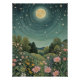 Cette illustration enchanteresse capture une scène nocturne magique dans une prairie en fleurs. Une lune pleine et lumineuse et un parfum d'étoiles dorées, dont une lune de croissant, illuminent un ciel tourbillonnant, texturé, turquoise et bleu foncé. Le premier plan est un champ animé de fleurs sauvages dans les tons rose, jaune, bleu et blanc, avec de l'herbe verte luxuriante et des collines ondoyantes derrière eux. Au milieu, une forêt d'arbres sereins aux verdures épaisses s'étend à travers le paysage, silhouette contre le ciel étoilé. Le sentiment général est celui de paix et d'émerveillement, comme un paysage rêvé d'un conte de fées.